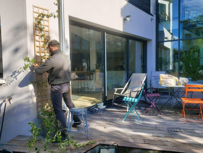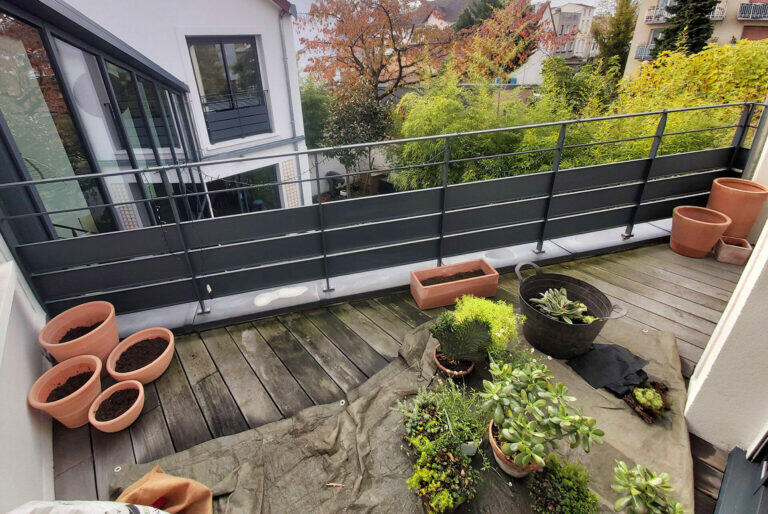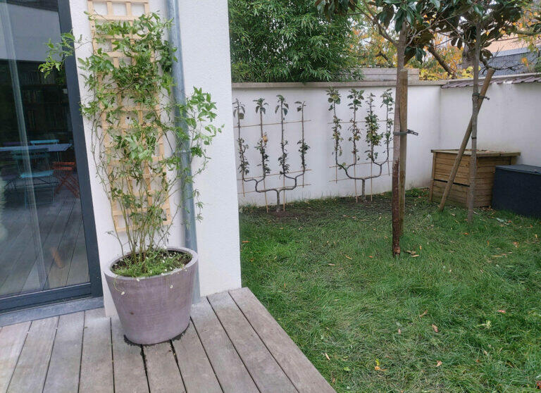 Les clients voulaient embellir le balcon donnant sur leur chambre et agrémenter de quelques végétaux leur terrasse. Pour cela deux pommiers palissés ont été ajoutés.