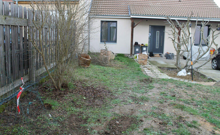 L’idée a été de faire un nivellement avec extraction du trop-plein de terre pour minimiser la butte à l’entrée de la maison. N’ayant pas de passage sur les côtés de la maison, la difficulté a été de la traverser afin de placer la terre extraite à l’arrière de la maison et ainsi créer deux espaces de pelouses.