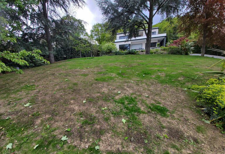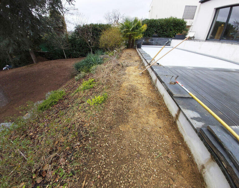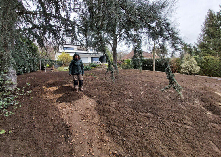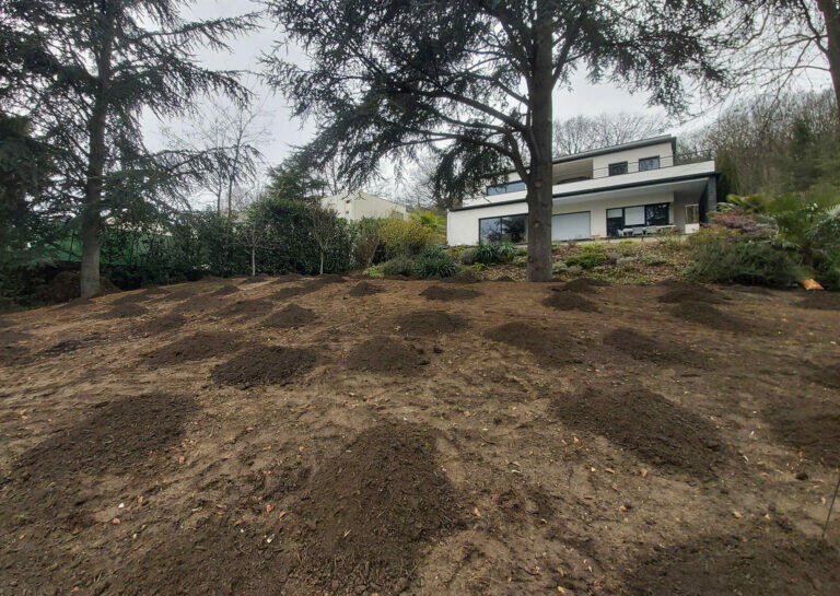 L’idée a été d’extraire la mousse, d’arracher des adventices. Puis le nivellement et le travail du sol, le terreautage et la mise en place d’un amendement naturel pour réguler le PH et l’acidité de la terre et ainsi irradier la mousse. Enfin, le nettoyage de la haie, la délimitation de bordures et semis de gazon.
